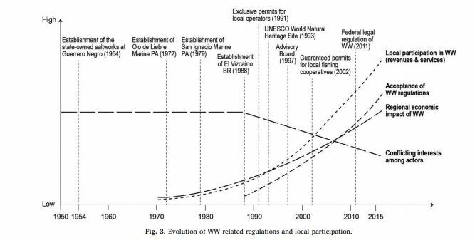 From 1991 onward, new laws were put in place requiring foreign tour operators to use local whale watching tour guides to offer trips for their guests. Guiding tours from their own boats (locally known as pangas) offered fishermen an alternative source of income during the whale migration season when the use of fishing nets or traps that could pose an entanglement risk to whales was banned4,6. One study demonstrated that the income lost from a ban on rock lobster fishing during the whale migration in the Ojo de Liebre lagoon was 400,000 USD per year, but income from whale watching created 600,000 USD of income6. Another 2007 study of the economic impacts of whale watching found that the income from whale watching activities in the EVBR more than compensated the losses to fishing communities from the seasonal fishing bans5.