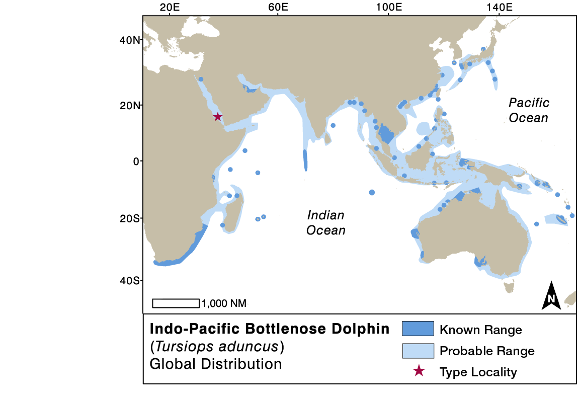 Indo-Pacific bottlenose dolphins are native to: Australia; Bahrain; Bangladesh; Brunei Darussalam; Cambodia; China; Comoros; Egypt; Eritrea; India; Indonesia; Iran, Islamic Republic of; Japan; Kenya; Madagascar; Malaysia; Mayotte; Mozambique; Myanmar; Oman; Pakistan; Papua New Guinea; Philippines; Saudi Arabia; Singapore; Solomon Islands; Somalia; South Africa; Sri Lanka; Taiwan, Province of China; Tanzania, United Republic of; Thailand; Timor-Leste; United Arab Emirates; Yemen