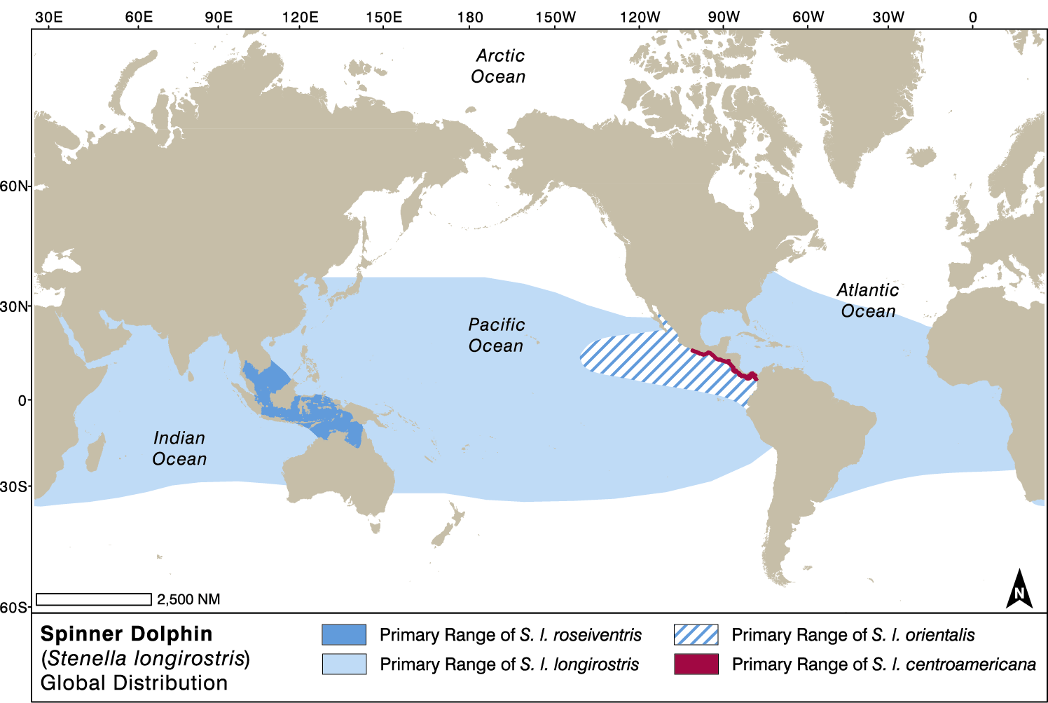 Spinner dolphins are native to the following countries and territories: American Samoa; Anguilla; Argentina; Aruba; Australia; Bahamas; Bahrain; Bangladesh; Belize; Bermuda; Bonaire, Sint Eustatius and Saba (Saba, Sint Eustatius); Brazil; British Indian Ocean Territory; Brunei Darussalam; Cambodia; Cabo Verde; Cayman Islands; China; Cocos (Keeling) Islands; Colombia; Comoros; Cook Islands; Costa Rica; Côte d'Ivoire; Cuba; Curaçao; Djibouti; Dominica; Dominican Republic; Ecuador (Galápagos); Egypt; El Salvador; Fiji; French Polynesia; Ghana; Guam; Guatemala; Guinea; Honduras; Hong Kong; India (Andaman Is., Nicobar Is.); Indonesia; Iran, Islamic Republic of; Jamaica; Japan (Honshu); Kenya; Kiribati; Liberia; Madagascar; Malaysia; Maldives; Marshall Islands; Martinique; Mauritius; Mexico; Micronesia, Federated States of ; Mozambique; Myanmar; New Caledonia; Nicaragua; Niue; Northern Mariana Islands; Oman; Pakistan; Panama; Papua New Guinea; Peru; Philippines; Puerto Rico; Réunion; Saint Helena, Ascension and Tristan da Cunha; Saint Kitts and Nevis; Saint Lucia; Saint Martin; Saint Vincent and the Grenadines; Samoa; Saudi Arabia; Senegal; Seychelles; Singapore; Solomon Islands; Somalia; South Africa (KwaZulu-Natal); Sri Lanka; Suriname; Taiwan, Province of China; Tanzania, United Republic of; Thailand; Tonga; Trinidad and Tobago; Tuvalu; United States (Hawaiian Islands); Uruguay; Vanuatu; Venezuela, Bolivarian Republic of; Viet Nam; Virgin Islands, British; Virgin Islands, US.