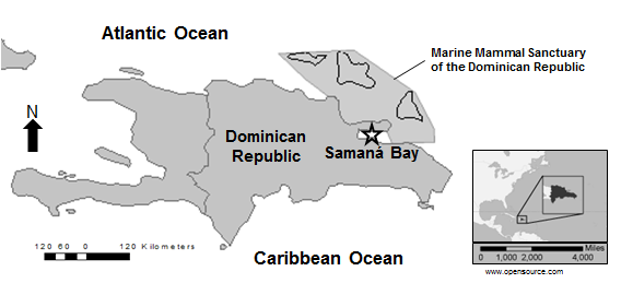 La República Dominicana (RD), que ocupa la mitad de la isla de La Española, posee la mayor industria de observación de ballenas del Caribe1,2. La observación de ballenas en la RD se estableció por primera vez en 1985 en la ciudad de Santa Bárbara de Samaná (en adelante referida como "Samaná"). En esa época, un operador turístico extranjero comenzó a acoger sobre todo turistas extranjeros para ir a ver ballenas jorobadas que visitan la Bahía de Samaná entre enero y marzo de cada año para aparearse, dar a luz y amamantar a sus crías. Posteriormente se añadieron muchos otros operadores turísticos, y en breve tiempo Samaná se convirtió en el lugar central de observación de ballenas, tanto para excursiones de un día en la Bahía de Samaná, como en calidad de puerto visitado por algunos cruceros vacacionales que transportan visitantes en mar abierto a los santuarios de mamíferos marinos de Bancos de la Plata (establecido en 1986) y en Bancos de la Navidad (establecido en 1986). Estos dos santuarios, junto con la zona cercana a la costa de Samaná, abarcan una superficie total de 25.000 kilómetros cuadrados y serán denominados en conjunto como el Santuario de Mamíferos Marinos de la República Dominicana (MMSDR por sus siglas en inglés).