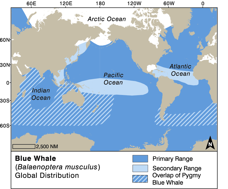 Las ballenas azules se encuentran en todos los océanos del mundo excepto el Ártico1,2 . Están también ausentes en algunos mares regionales, como los mares Mediterráneo, de Ojotsk y de Bering. Casi nunca se les ve frente a las costas orientales de América del Sur o de Australia. Pese a su amplia distribución no es frecuente encontrar ballenas azules, debido en parte a su reducido número, y en parte porque generalmente se encuentran en aguas de alta mar, conociéndose solo pocas zonas costeras de cría y alimentación.