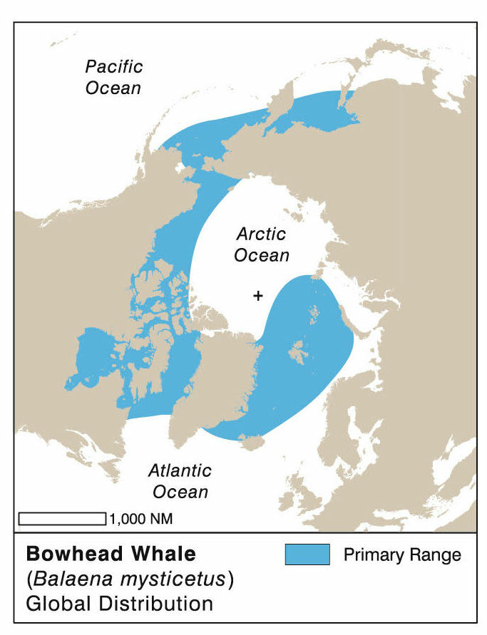 Actualmente hay cuatro poblaciones reconocidas o poblaciones reproductoras de ballenas de Groenlandia: 1) Una pequeña población genéticamente distinta, restringida al mar de Ojotsk; 2) la población de los mares de Bering-Chukchi-Beaufort (BCB); 3) la población de Canadá oriental Groenlandia occidental; y 4) la población de Spitsbergen2. En toda el área de distribución de la especie, las ballenas de Groenlandia se encuentran generalmente en aguas de menos de 200 metros de profundidad y, a menudo, cerca de la tierra firme o del hielo marino2,7.