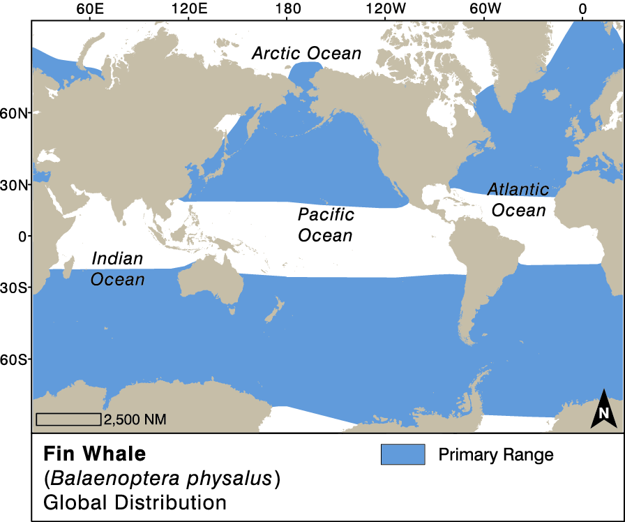 Les rorquals communs sont largement présents dans les eaux froides de haute mer. Ils sont rarement observés sous les tropiques, à l’exception des zones où l’on trouve des remontées régulières d’eau froide, comme au large des côtes du Pérou1. Bien que l’espèce ait été commercialement importante pour la chasse à la baleine, sa répartition et ses déplacements saisonniers sont mal connus. Alors que l’on pense que la plupart des populations font des déplacements saisonniers vers les pôles pour se nourrir en été et vers les régions subtropicales pour la mise bas et l’accouplement en hiver, certaines populations, comme celles du golfe de Californie, de la mer de Chine orientale au large du Japon, et de la Méditerranée2,3 semblent être présentes toute l’année.