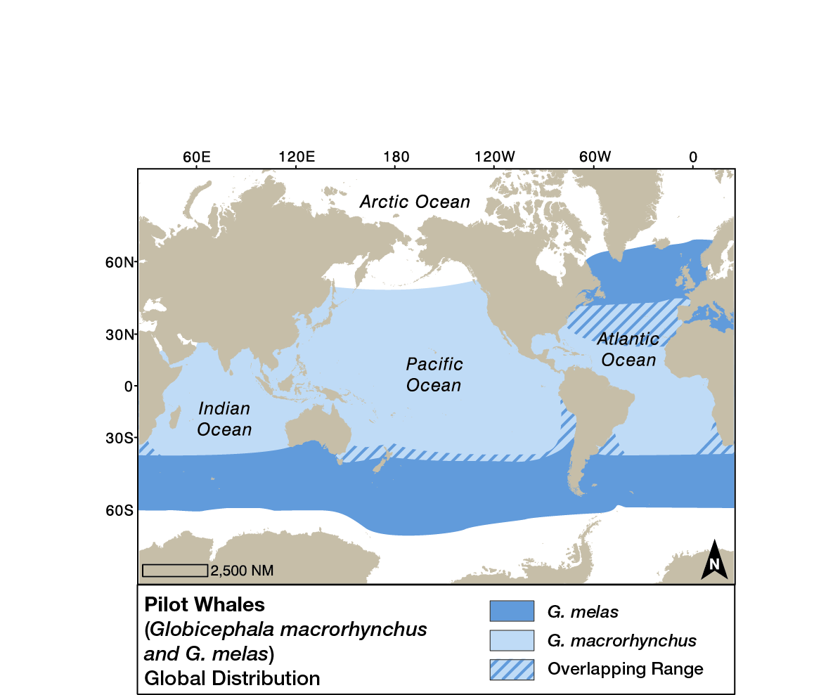 Short-finned pilot whales have a mostly tropical and warm-temperate distribution which includes both nearshore and open-ocean waters. Long-finned pilot whales, on the other hand, are found in cool-temperate and sub-polar waters of the Southern Hemisphere but only the North Atlantic and Mediterranean in the Northern Hemisphere. Long-finned pilot whales were previously found in the western North Pacific as well, but appear to be absent there today4. Pilot whales are generally nomadic, but a few resident populations have been identified and studied in different locations. They are apparently attracted to areas with varied depth contours that can be linked with high productivity.2